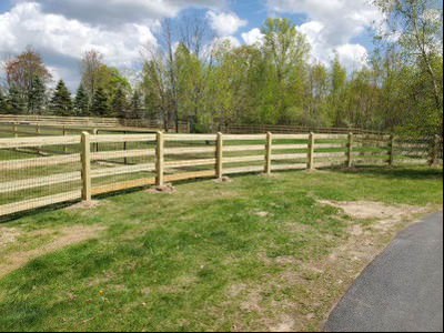 We always prioritize safety when installing fencing for equestrian or farm properties. This horse fence in Port Jervis NY is constructed with pressure-treated posts and rails for maximum longevity. The black woven wire is tightly secured to each section, ensuring there are no loose areas that could pose a risk to animals.